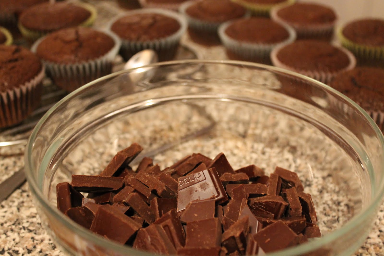 While the ganache is cooling, use either a 1-inch cookie cutter or an apple corer to cut the centers out of the cooled cupcakes. You should go about 2/3 of the way down the cupcakes. I used an apple corer, and if you twist after putting it in the cupcake, the center of the cupcake will come out when you pull the corer out. If this doesn't work, use a small spoon to get the center out. Put the ganache into a piping bag ( I used a big plastic baggy that I cut the tip off of) with a wide tip and then fill each of the cupcakes to the top.